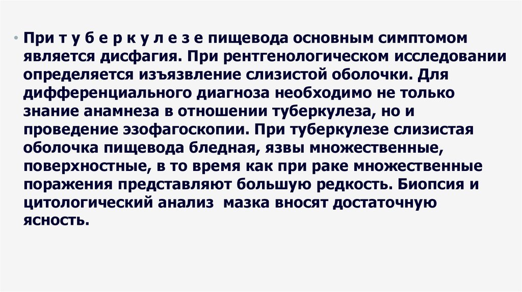 • При т у б е р к у л е з е пищевода основным симптомомявляется дисфагия. При рентгенологическом исследовании