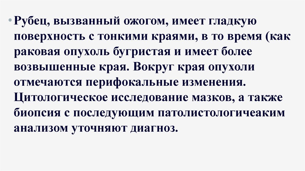 • Рубец, вызванный ожогом, имеет гладкуюповерхность с тонкими краями, в то время (как