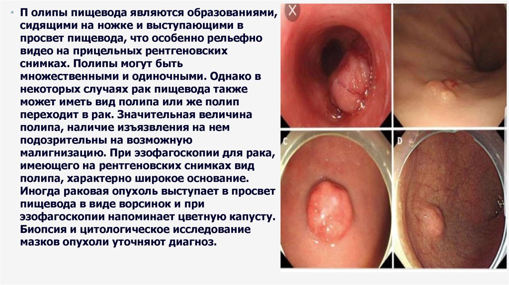 • П олипы пищевода являются образованиями,сидящими на ножке и выступающими в
