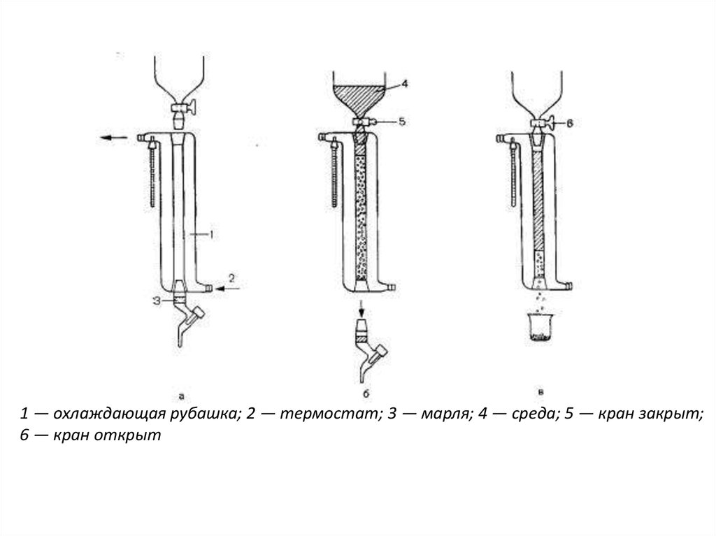 1 — охлаждающая рубашка; 2 — термостат; 3 — марля; 4 — среда; 5 — кран закрыт;6 — кран открыт