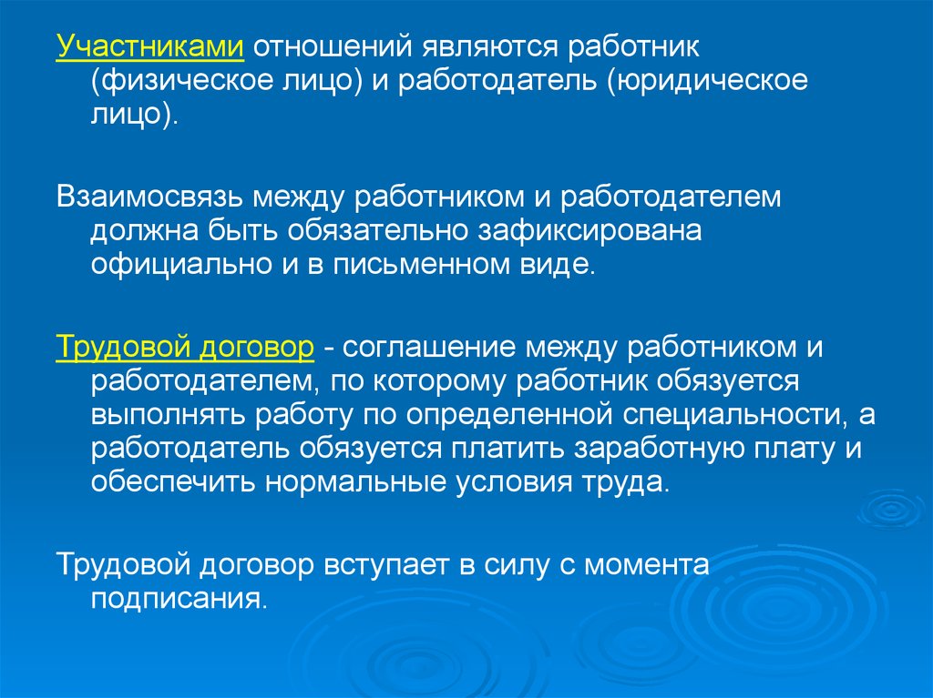 Участниками отношений являются работник(физическое лицо) и работодатель (юридическое