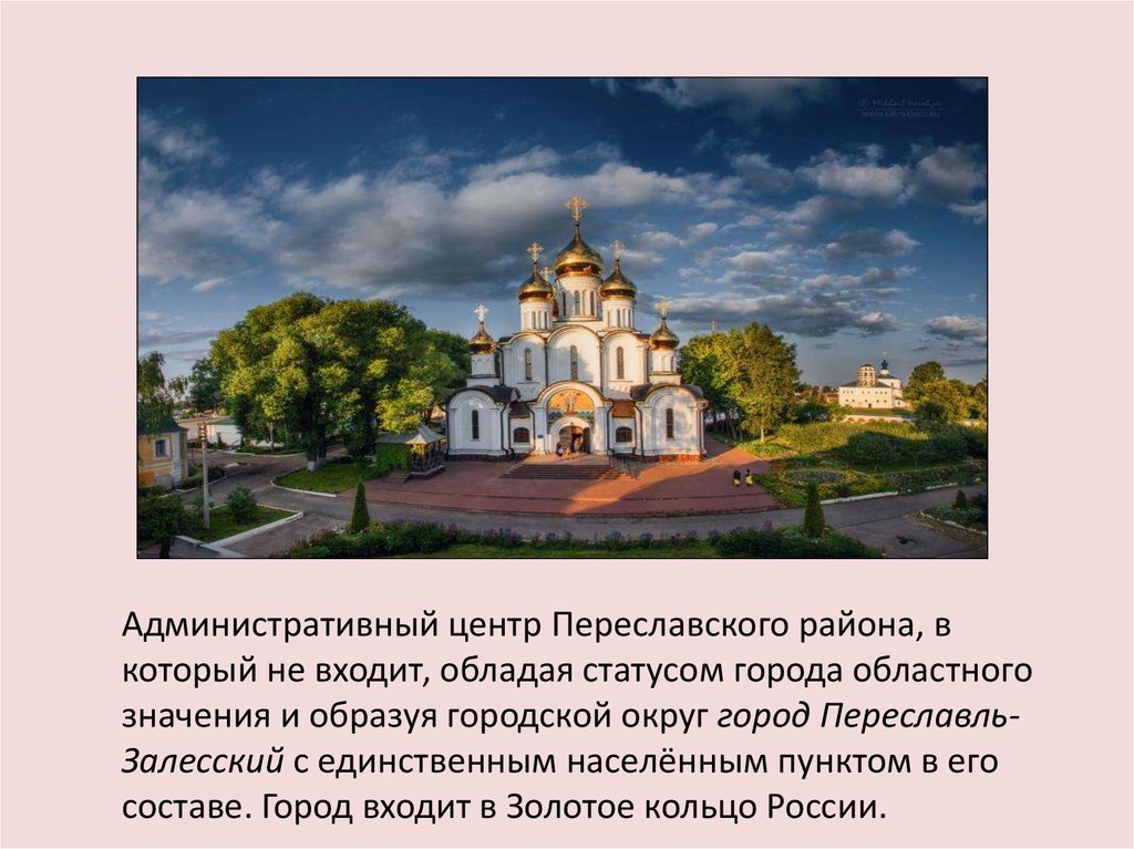 Административный центр Переславского района, вкоторый не входит, обладая статусом города областного