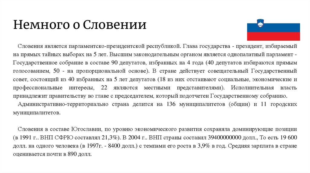 Немного о СловенииСловения является парламентско-президентской республикой. Глава государства - президент, избираемый