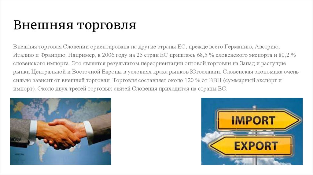 Внешняя торговляВнешняя торговля Словении ориентирована на другие страны ЕС, прежде всего Германию, Австрию,
