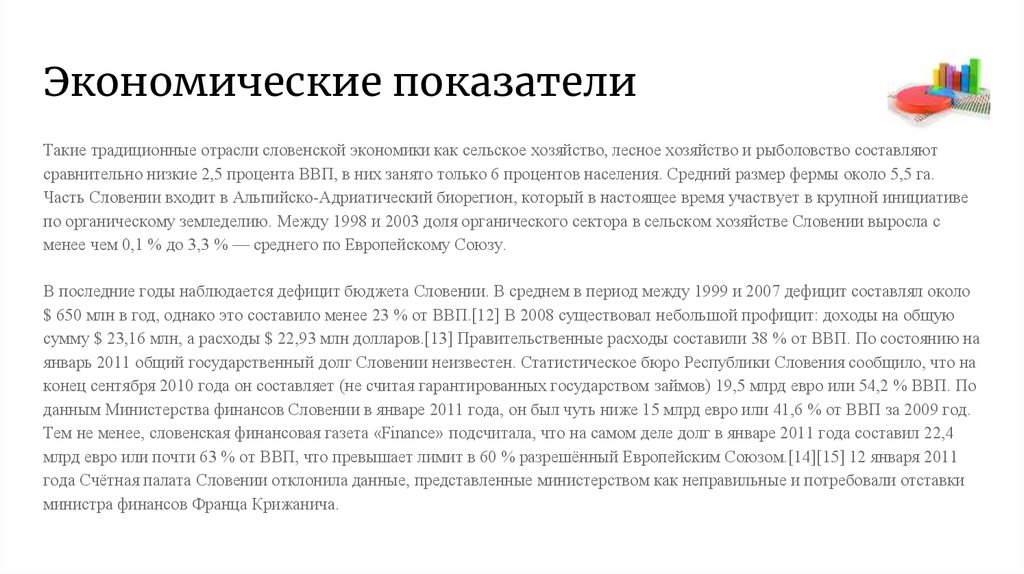 Экономические показателиТакие традиционные отрасли словенской экономики как сельское хозяйство, лесное хозяйство и рыболовство составляют