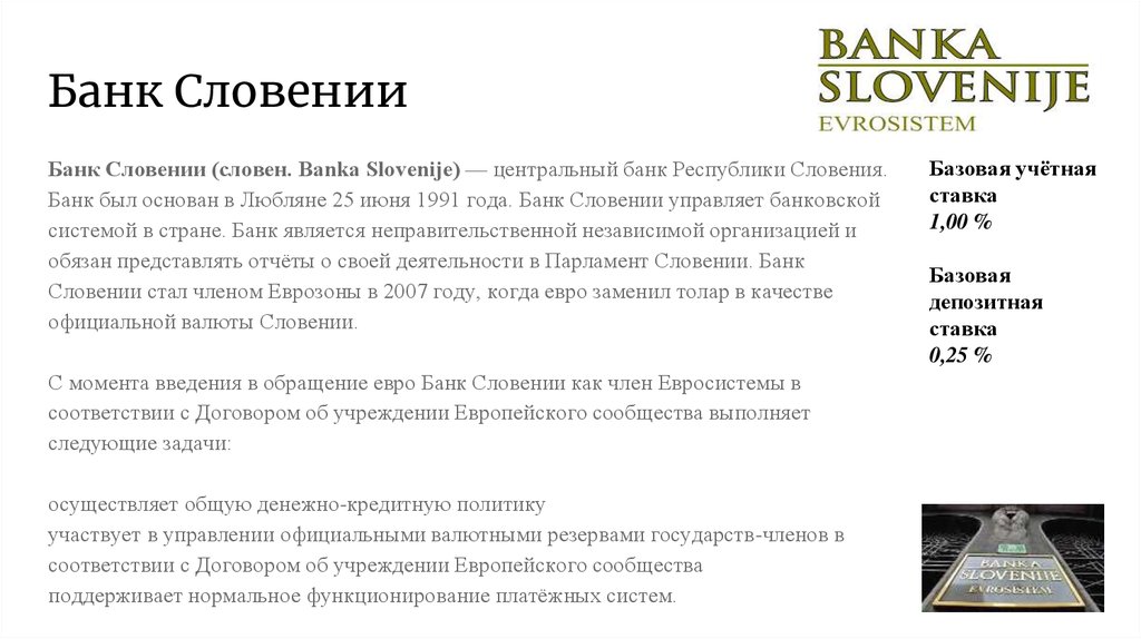 С момента введения в обращение евро Банк Словении как член Евросистемы в