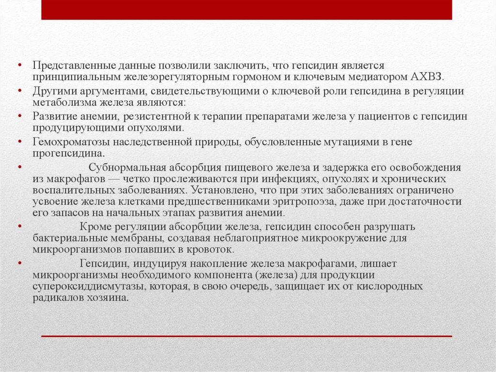 • Представленные данные позволили заключить, что гепсидин являетсяпринципиальным железорегуляторным гормоном и ключевым медиатором АХВЗ.