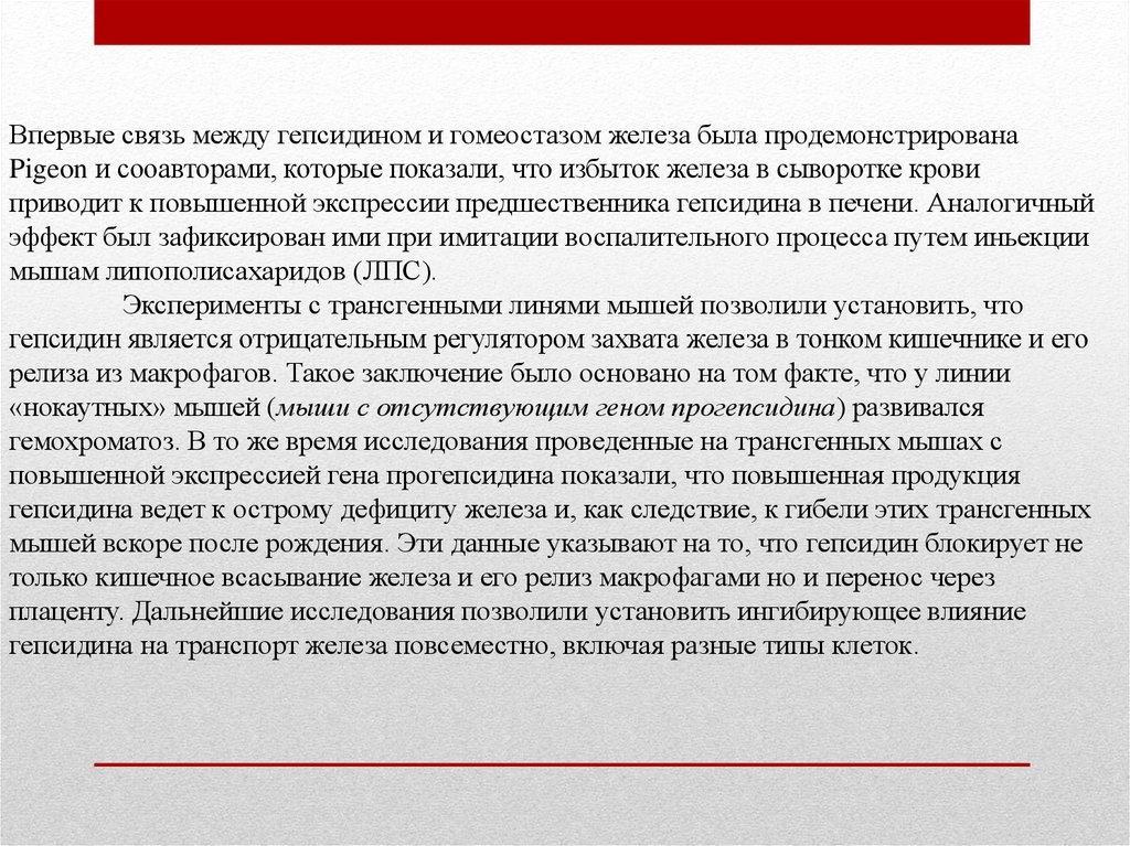 Впервые связь между гепсидином и гомеостазом железа была продемонстрированаPigeon и сооавторами, которые показали, что избыток железа в сыворотке крови