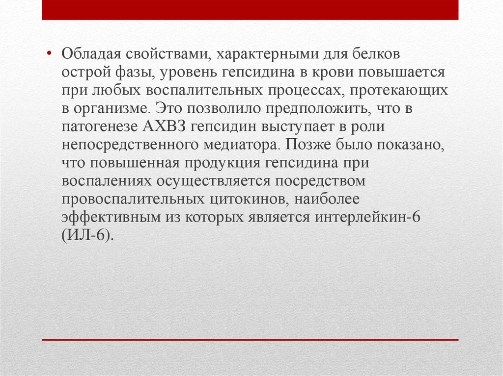 • Обладая свойствами, характерными для белковострой фазы, уровень гепсидина в крови повышается