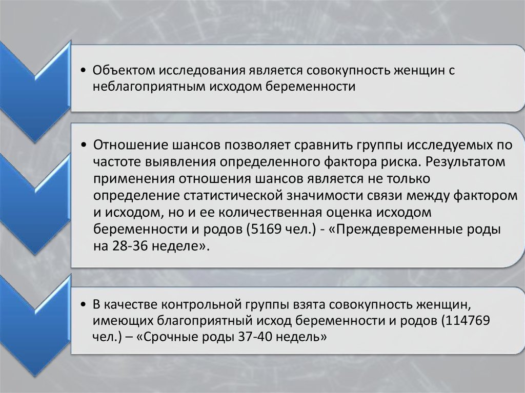 • Объектом исследования является совокупность женщин снеблагоприятным исходом беременности