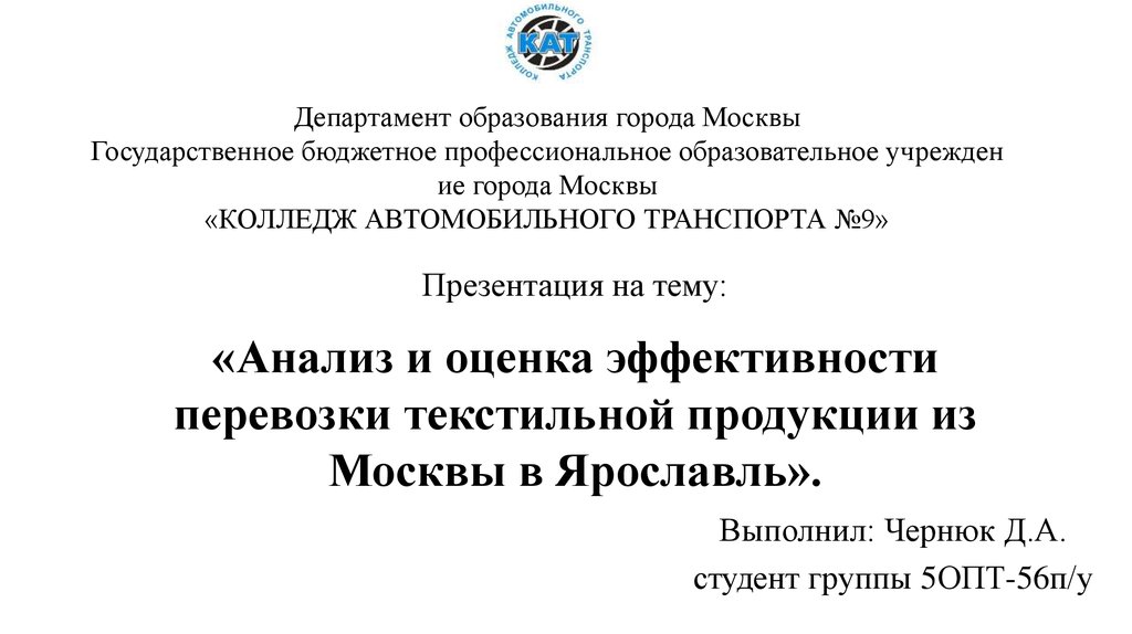 1. Презентация на тему: «Анализ и оценка эффективности перевозки текстильной продукции из Москвы в Ярославль».