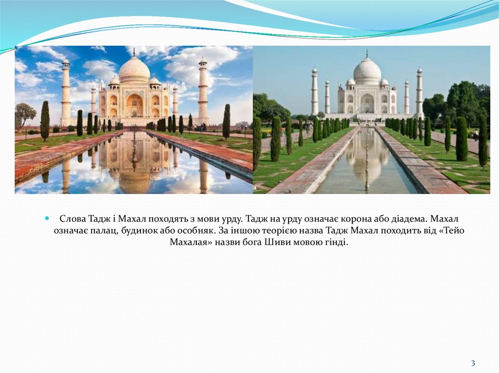 Слова Тадж і Махал походять з мови урду. Тадж на урду означає корона або діадема. Махалозначає палац, будинок або особняк. За іншою теорією назва Тадж Махал походить від «Тейо