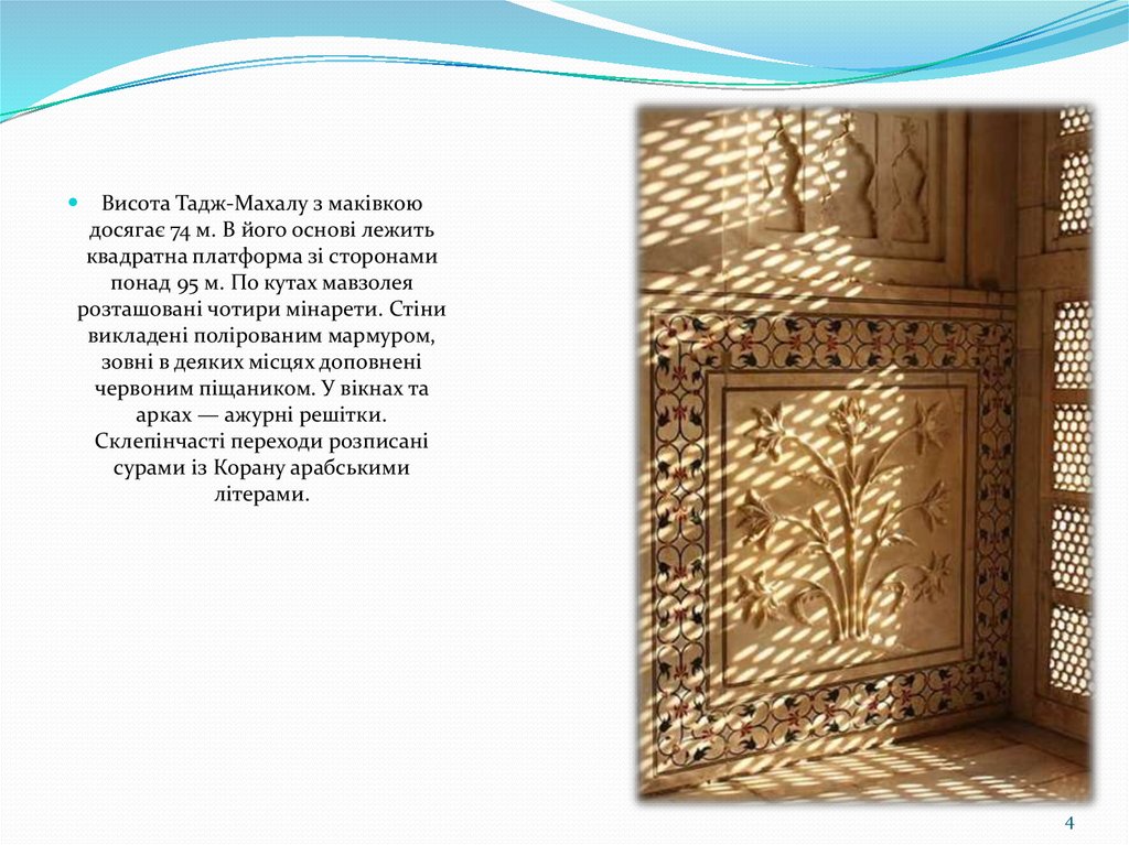 Висота Тадж-Махалу з маківкоюдосягає 74 м. В його основі лежить