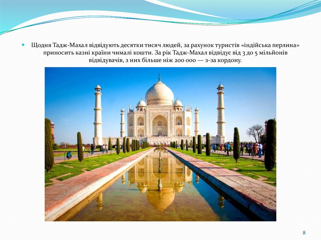 Щодня Тадж-Махал відвідують десятки тисяч людей, за рахунок туристів «індійська перлина»приносить казні країни чималі кошти. За рік Тадж-Махал відвідує від 3 до 5 мільйонів