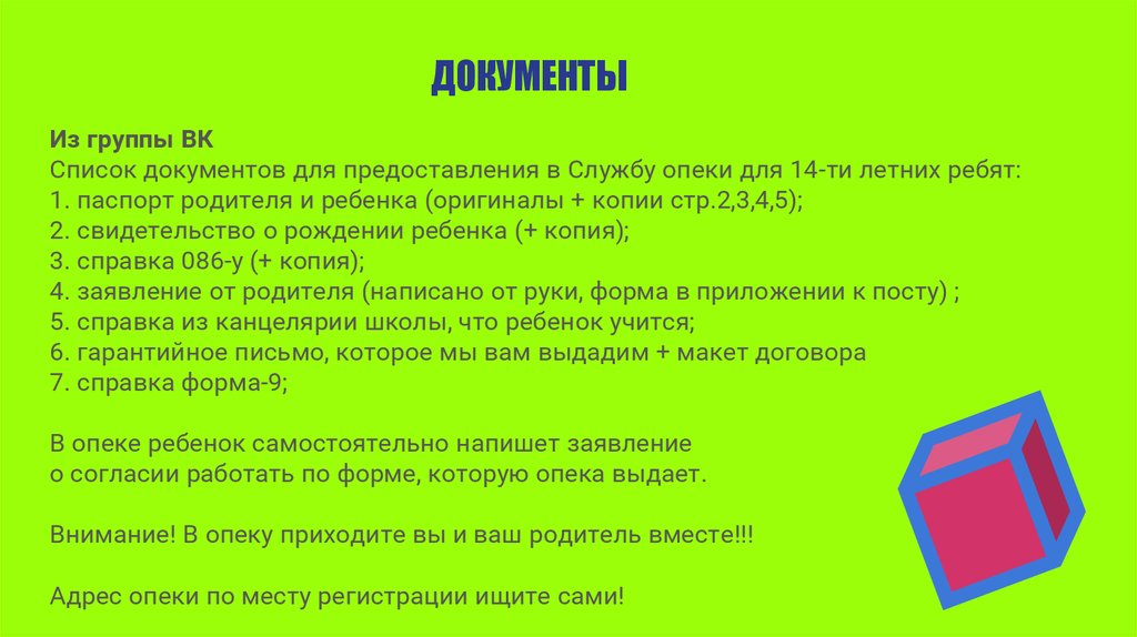 Список документов для предоставления в Службу опеки для 14-ти летних ребят: