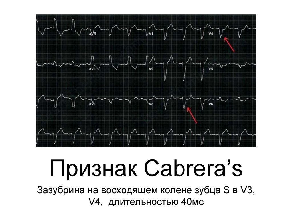 Признак Cabrera’sЗазубрина на восходящем колене зубца S в V3,