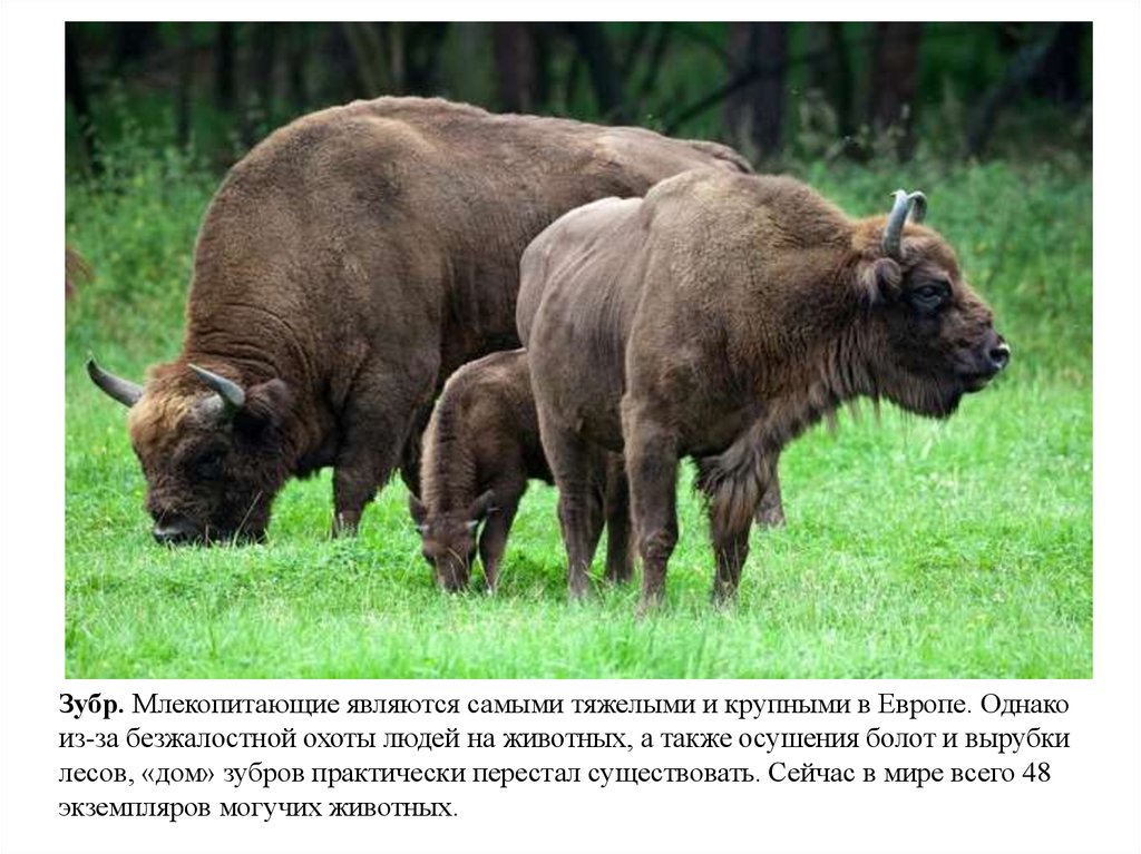 Зубр. Млекопитающие являются самыми тяжелыми и крупными в Европе. Однакоиз-за безжалостной охоты людей на животных, а также осушения болот и вырубки