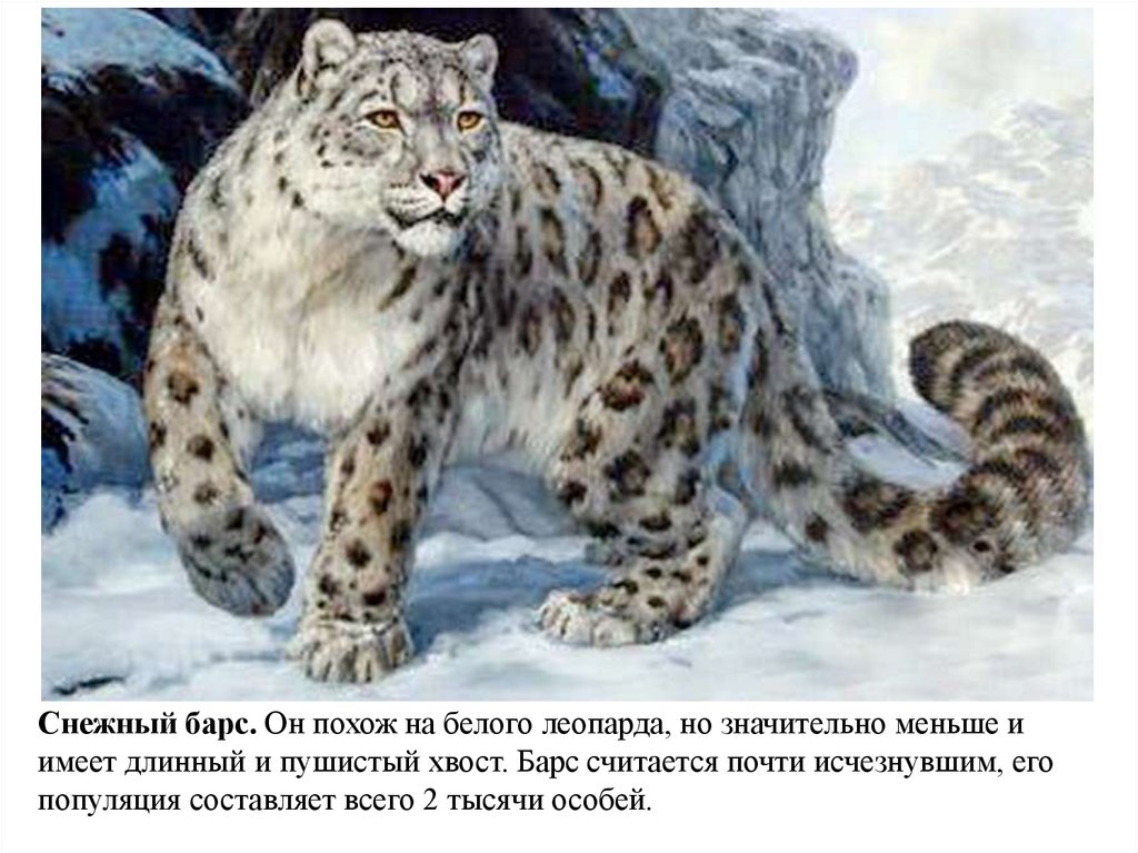 Снежный барс. Он похож на белого леопарда, но значительно меньше иимеет длинный и пушистый хвост. Барс считается почти исчезнувшим, его