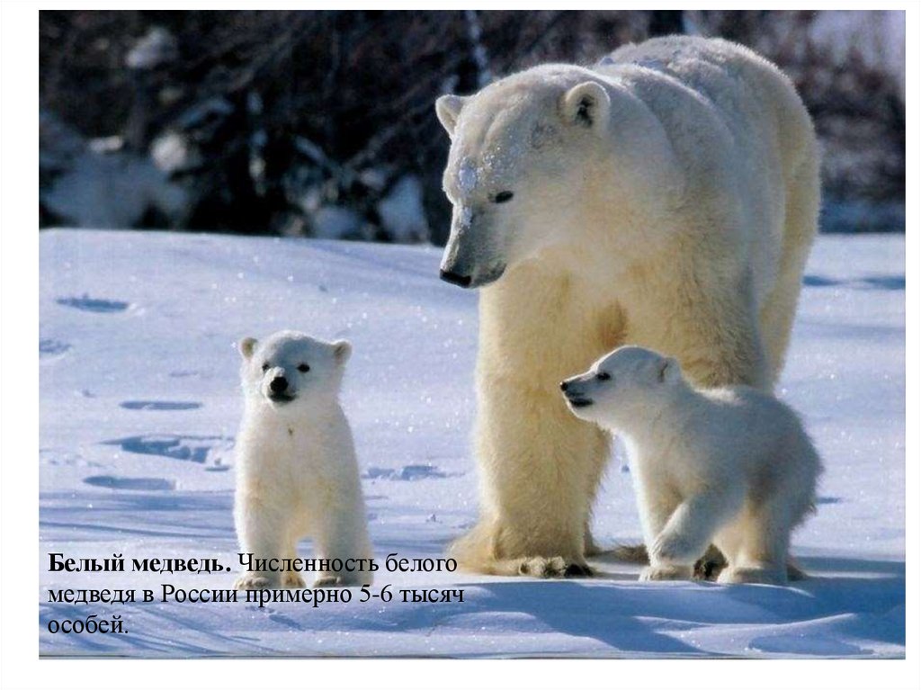 Белый медведь. Численность белогомедведя в России примерно 5-6 тысяч