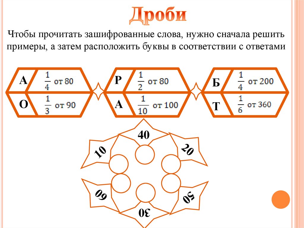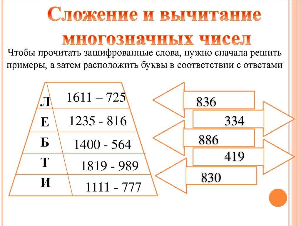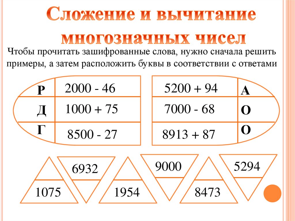 Чтобы прочитать зашифрованные слова, нужно сначала решитьпримеры, а затем расположить буквы в соответствии с ответами