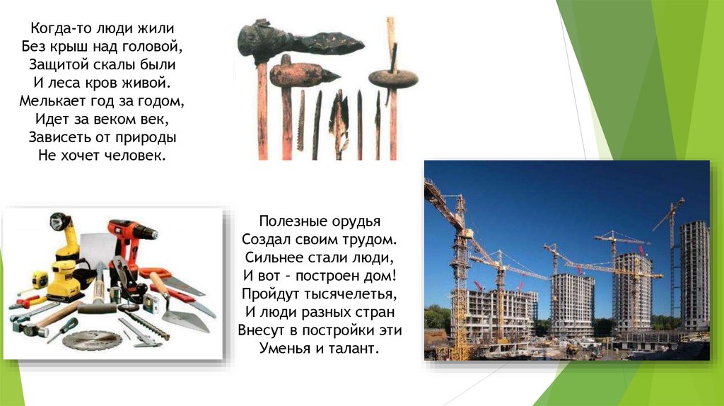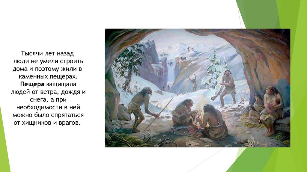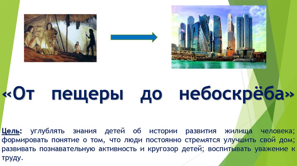 1. «От пещеры до небоскрёба» Цель: углублять знания детей об истории развития жилища человека; формировать понятие о том, что люди