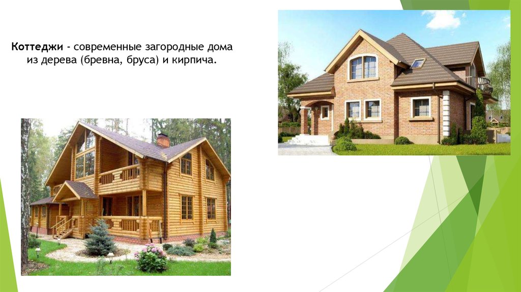 Коттеджи - современные загородные домаиз дерева (бревна, бруса) и кирпича.