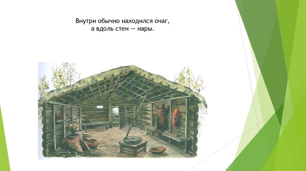 Внутри обычно находился очаг,а вдоль стен — нары.