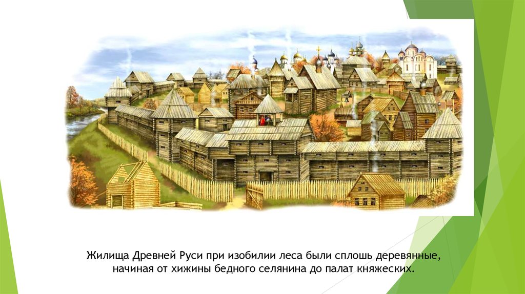 Жилища Древней Руси при изобилии леса были сплошь деревянные,начиная от хижины бедного селянина до палат княжеских.