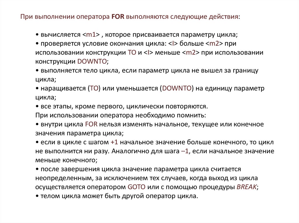 При выполнении оператора FOR выполняются следующие действия:• вычисляется <m1> , которое присваивается параметру цикла;