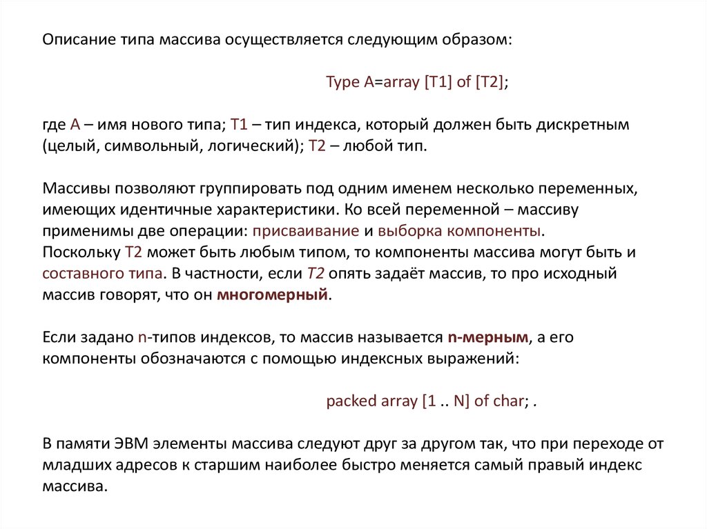 Любой объект массивного типа (массив) состоит из фиксированногочисла компонент (число определяется при введении этого массивного типа). Все