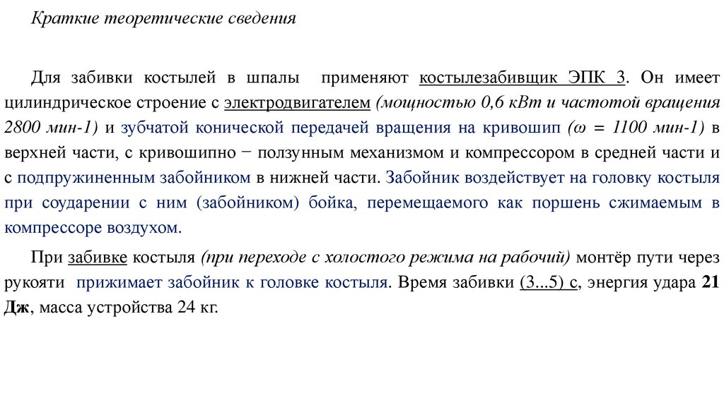 Краткие теоретические сведенияДля забивки костылей в шпалы применяют костылезабивщик ЭПК 3. Он имеет