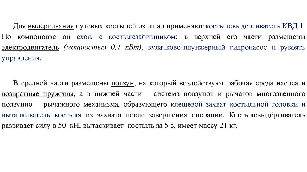Для выдёргивания путевых костылей из шпал применяют костылевыдёргиватель КВД 1.По компоновке он схож с костылезабивщиком: в верхней его части размещены