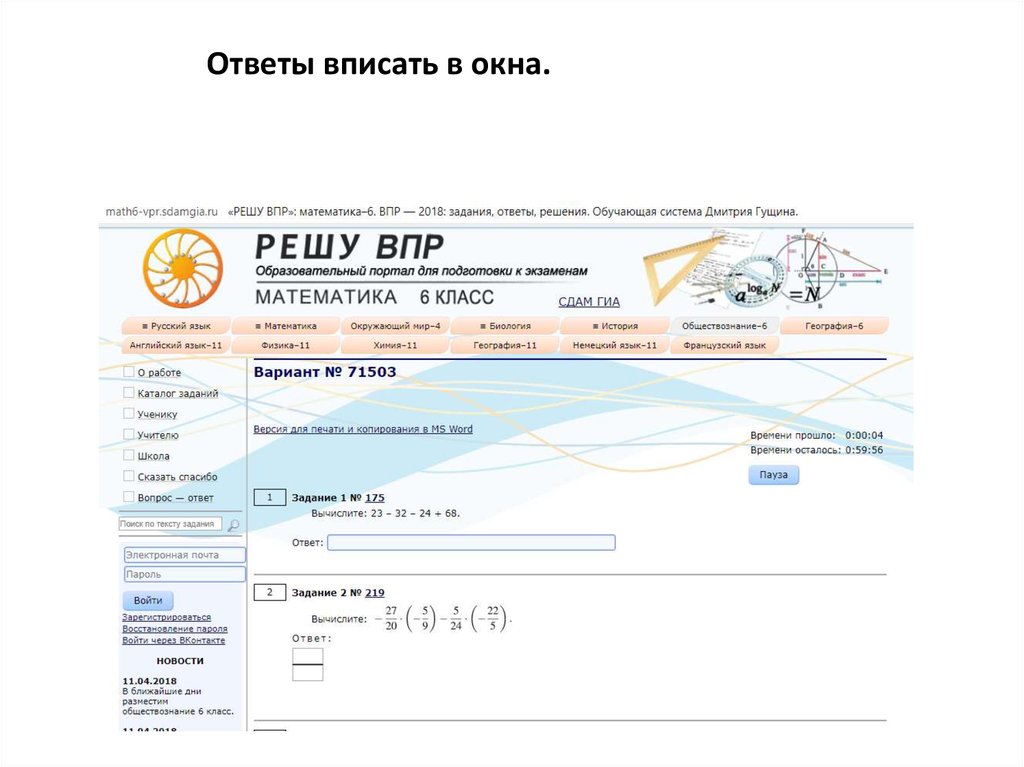 Ответы вписать в окна.