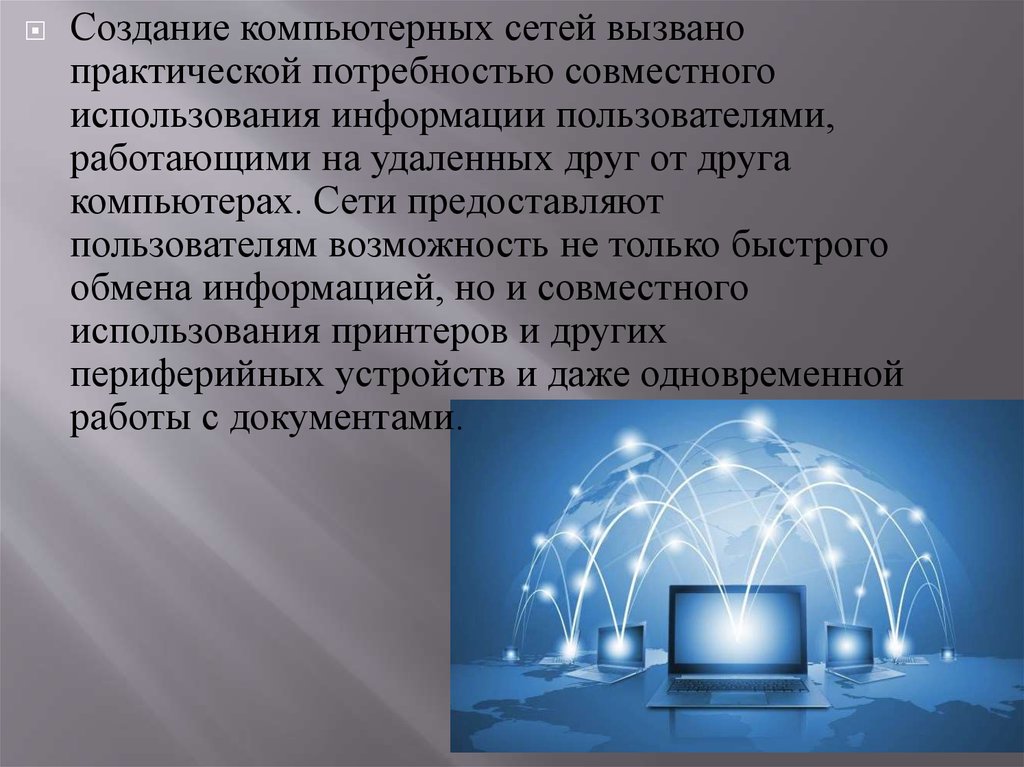 Создание компьютерных сетей вызванопрактической потребностью совместного
