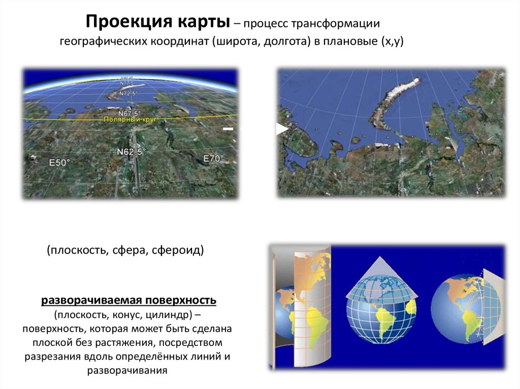 Проекция карты – процесс трансформациигеографических координат (широта, долгота) в плановые (x,y)