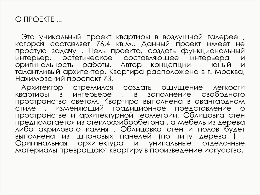 О ПРОЕКТЕ ...Это уникальный проект квартиры в воздушной галерее ,