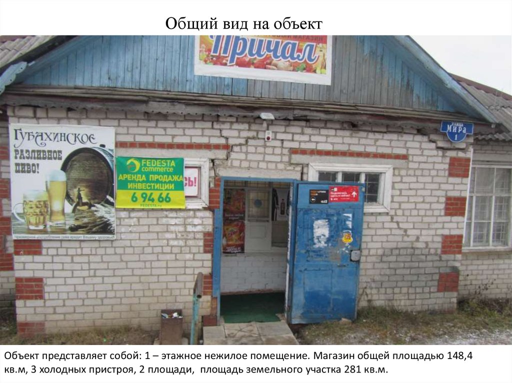 Общий вид на объектОбъект представляет собой: 1 – этажное нежилое помещение. Магазин общей площадью 148,4
