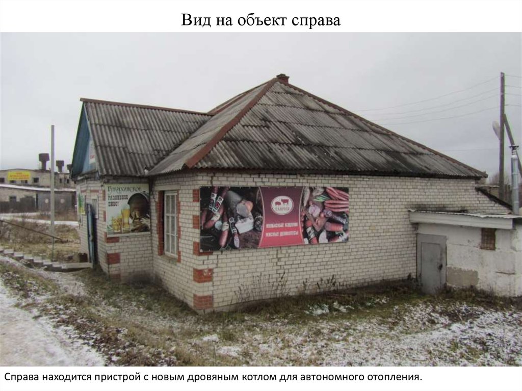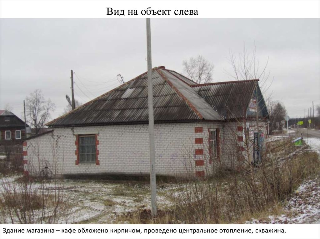 Вид на объект слеваЗдание магазина – кафе обложено кирпичом, проведено центральное отопление, скважина.
