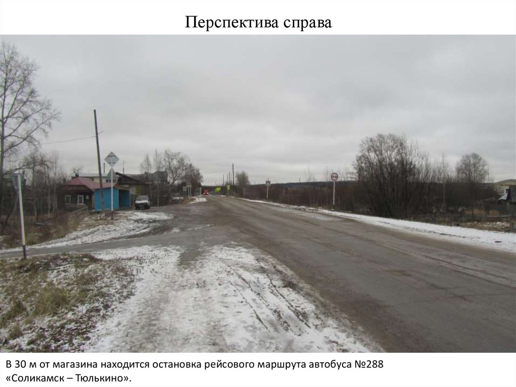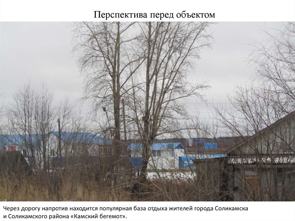 Перспектива перед объектомЧерез дорогу напротив находится популярная база отдыха жителей города Соликамска