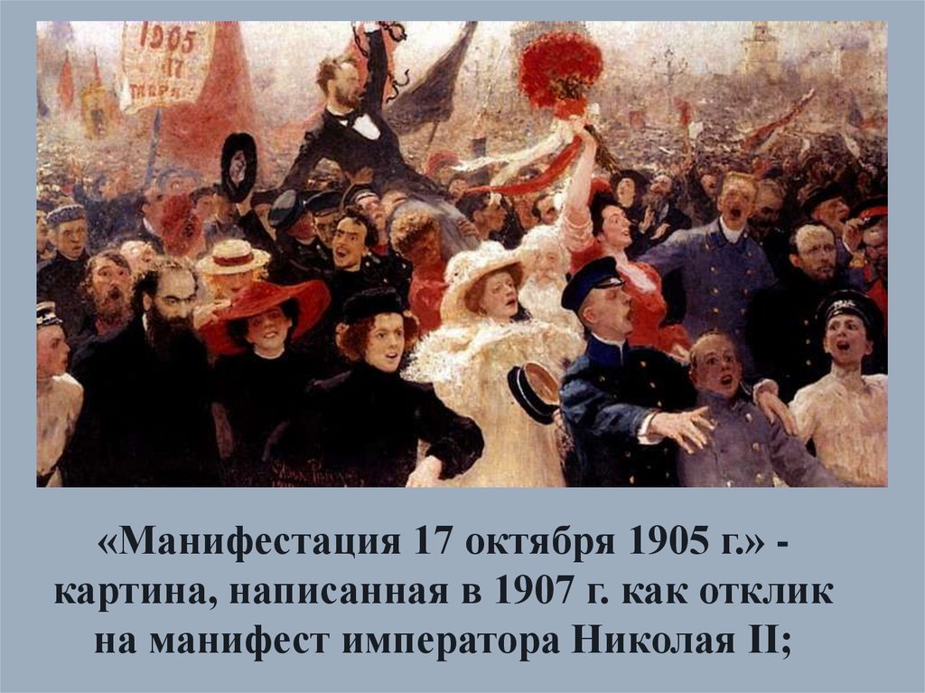 «Манифестация 17 октября 1905 г.» картина, написанная в 1907 г. как откликна манифест императора Николая II;