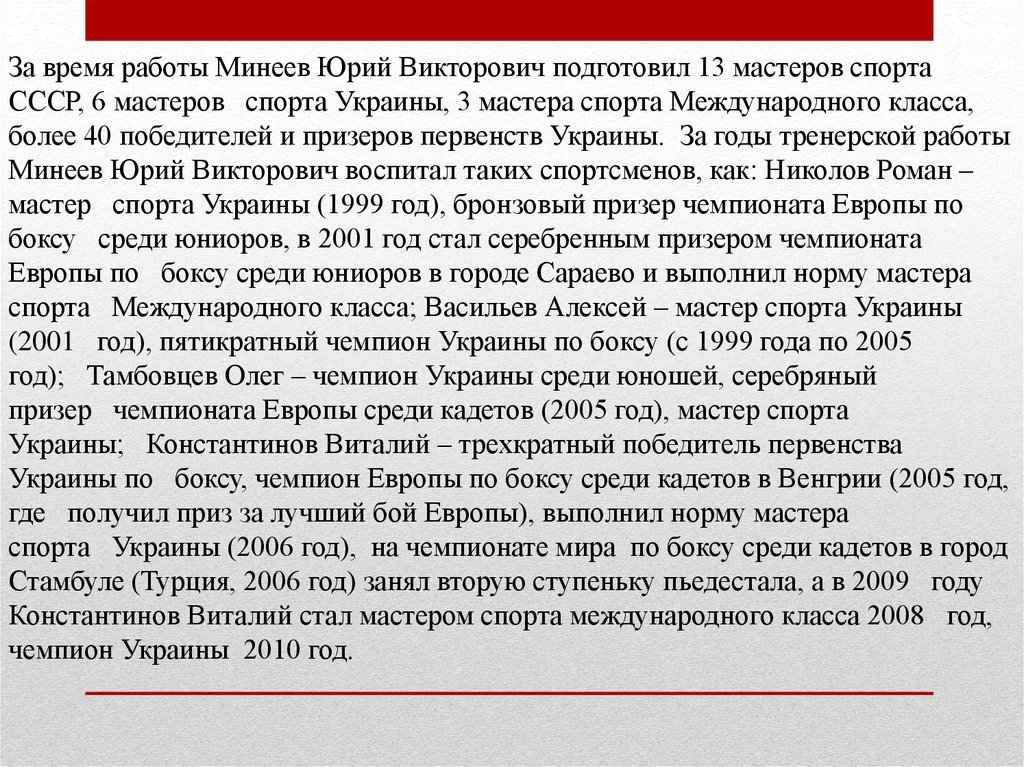 • За время работы Минеев Юрий Викторович подготовил 13 мастеров спорта СССР, 6
