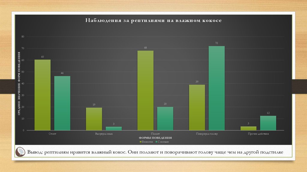 Вывод: рептилиям нравится влажный кокос. Они ползают и поворачивают голову чаще чем на другой подстилке