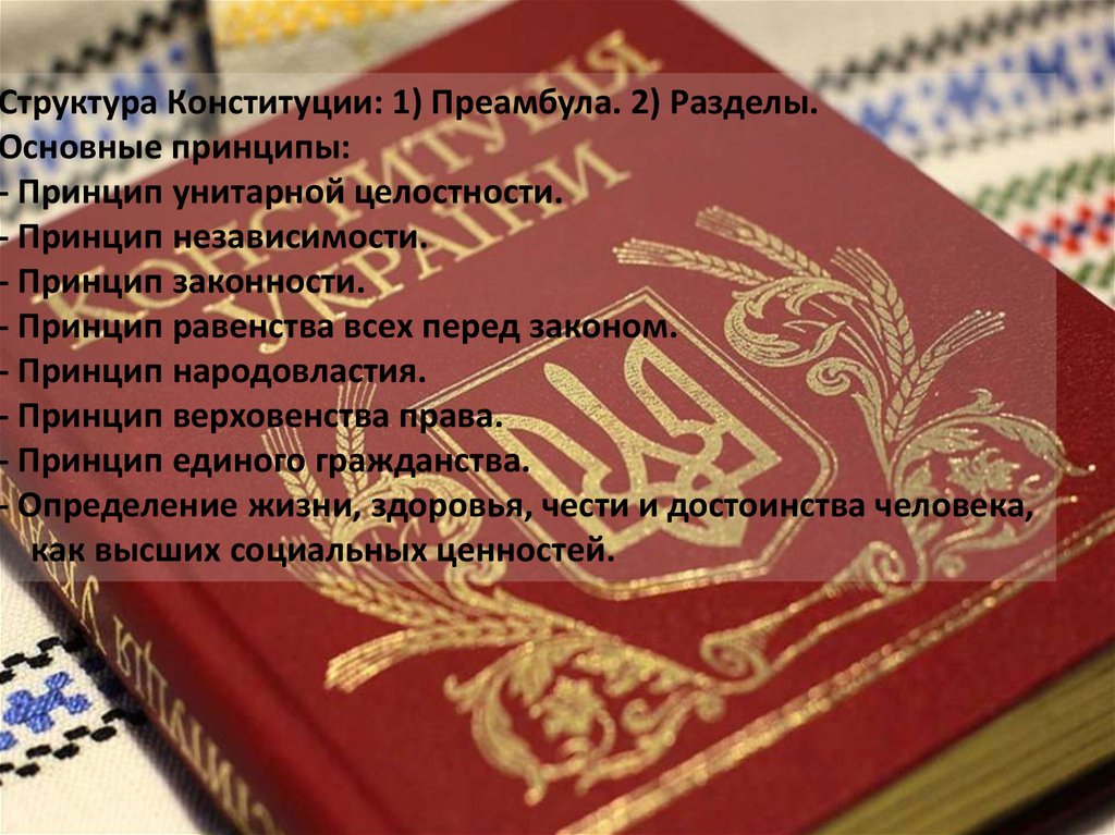 Структура Конституции: 1) Преамбула. 2) Разделы.Основные принципы: