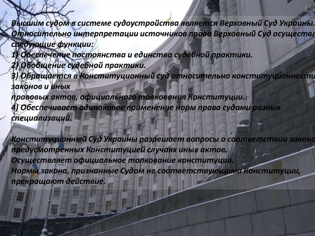 Высшим судом в системе судоустройства является Верховный Суд Украины.Относительно интерпретации источников права Верховный Суд осуществл