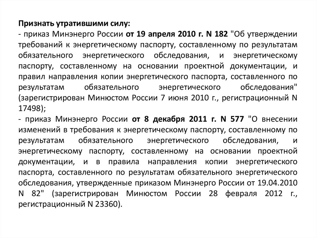 Признать утратившими силу:- приказ Минэнерго России от 19 апреля 2010 г. N 182 "Об утверждении