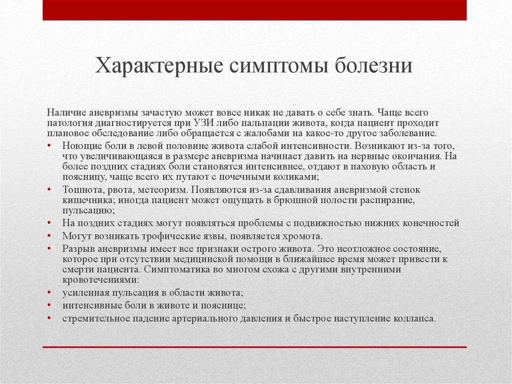 Характерные симптомы болезниНаличие аневризмы зачастую может вовсе никак не давать о себе знать. Чаще всего