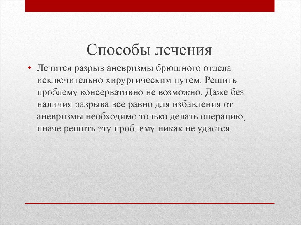 Способы лечения• Лечится разрыв аневризмы брюшного отдела