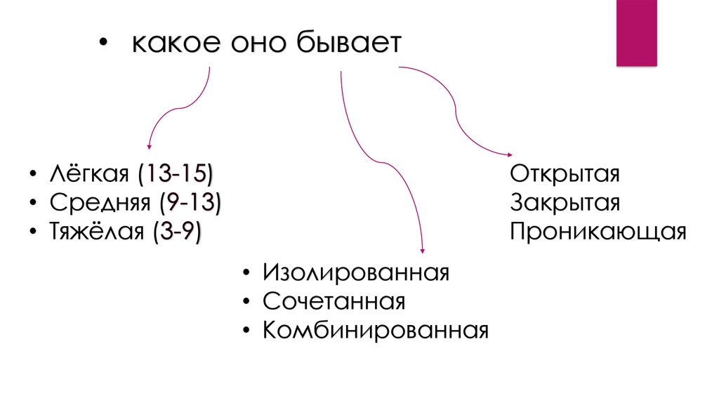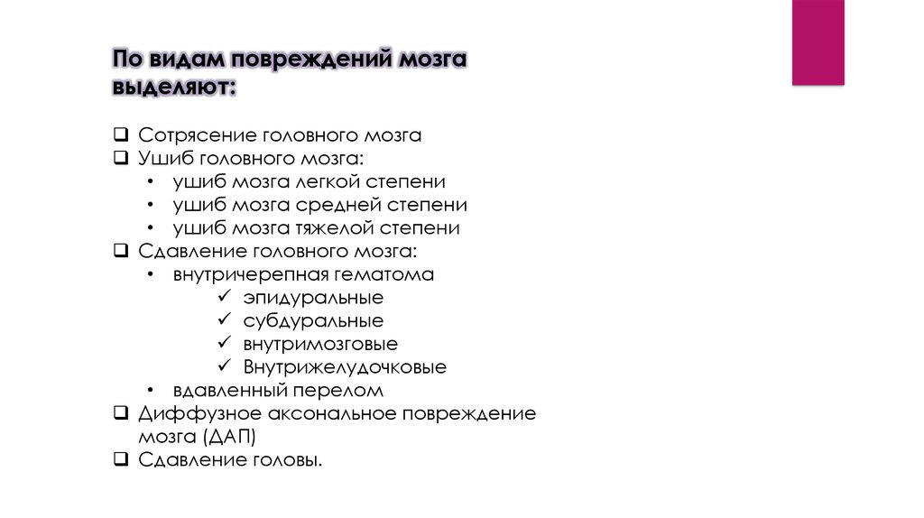 По видам повреждений мозгавыделяют: