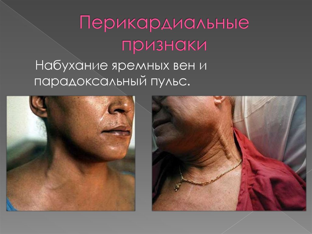 Набухание яремных вен ипарадоксальный пульс.