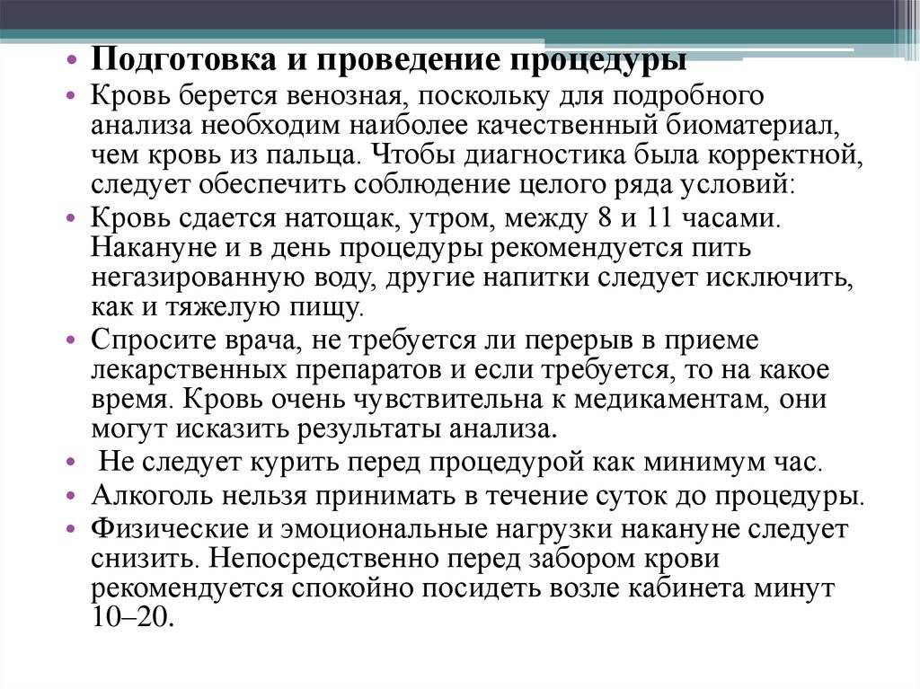 • Подготовка и проведение процедуры• Кровь берется венозная, поскольку для подробного